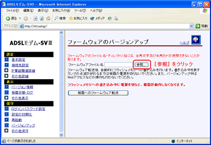 - 画面右側の操作フレームにある【ファームウェアのバージョンアップ】にて「参照」をクリックします。