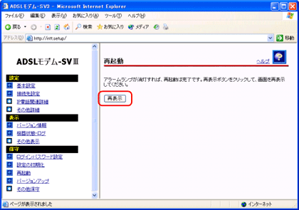 - アラームランプが消灯すれば、再起動は完了です。[再表示]ボタンをクリックしてください。