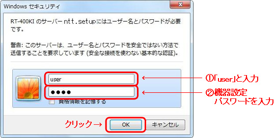 [ntt.setupに接続]が表示されます。[ユーザー名]に「user」と入力し、[パスワード]に初期設定時に設定した機器設定用パスワードを入力し、[OK]をクリックします。 |