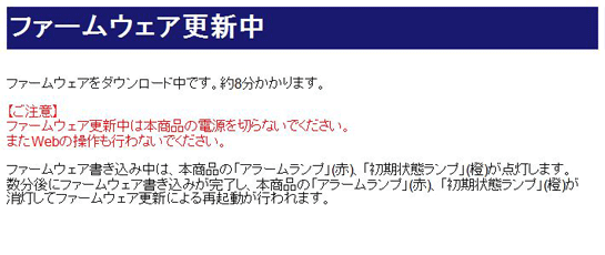 ファームアップ中は以下の画面が表示されます。ファームウェア更新完了するまで電源を抜かずにお待ちください。