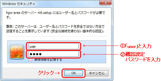 [ntt.setupに接続]が表示されます。[ユーザー名]に「user」と入力し、[パスワード]に初期設定時に設定した機器設定用パスワードを入力し、[OK]をクリックします。