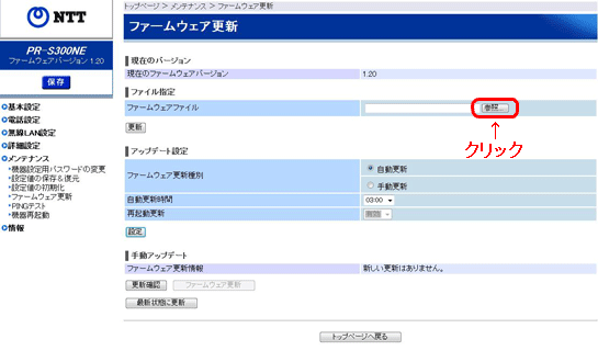 「メンテナンス」から「ファームウェアの更新」を選択します。 |