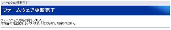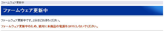 ファームアップ中は以下の画面が表示されます。ファームウェア更新完了するまで電源を抜かずにお待ちください。アラームランプ消灯後、「再表示」をクリックします。 |