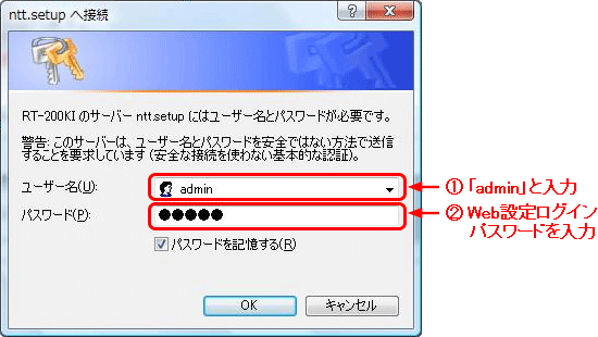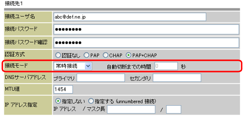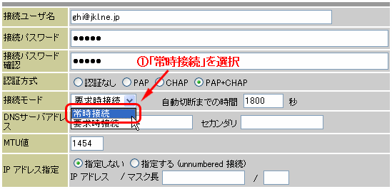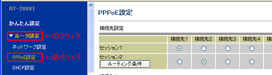 PCとRT-200KIのLANポートがLANケーブルで接続されていることを確認し、WebブラウザのURL欄に「http://ntt.setup/」を入力します。 [ntt.setup に接続]が表示されます。[ユーザー名]に「admin」と入力し、[パスワード]に初期設定時に設定したWeb設定ログインパスワードを入力し、[OK]をクリックします。 [かんたん設定]画面が表示されます。設定画面の左メニュー画面の[ルータ設定]−[PPPoE設定]を選択します。 [PPPoE設定]画面の設定変更を行う接続先の「接続モード」欄で「常時接続」を選択し、「確認」、「送信」ボタンの順にクリックします。(例;接続先3の設定を変更する場合) ===== (中略) ===== 左メニューの「反映」ボタンをクリックします。再起動後、設定が反映されます。