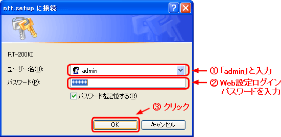 [ntt.setupに接続]が表示されます。[ユーザー名]に「admin」と入力し、[パスワード]に初期設定時に設定したWeb設定ログインパスワードを入力し、[OK]をクリックします。