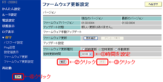 - [定時更新時間]で、バージョンアップ時間を指定し、[確認]−[送信] −[反映]ボタンの順にクリックします。なお、定時更新時間は、通常ひかり電話やインターネット等を利用しない時間帯に設定することお薦めします。(3項にて「即時更新」を選択した場合は、時間の設定はありませんので、そのまま[確認]−[送信]