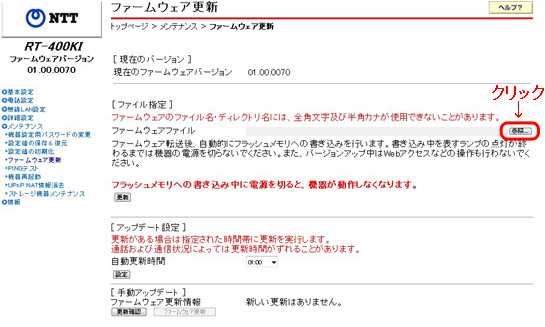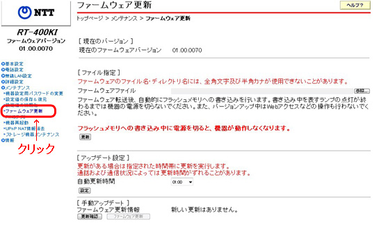 ファームウェアの自動更新は順次実施しておりますので、「自動更新」と設定している場合でもすぐにファームウェアの更新が実施されない場合があります。早期にファームウェアを更新したい場合は、本商品のWeb設定画面から手動にて実施してください。 (以下バージョンアップ方法をご覧ください)
