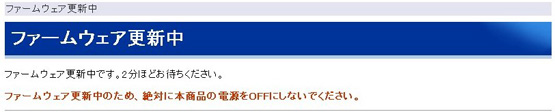 ファームアップ中は以下の画面が表示されます。ファームウェア更新完了するまで電源を抜かずにお待ちください。アラームランプ消灯後、「再表示」をクリックします。 |