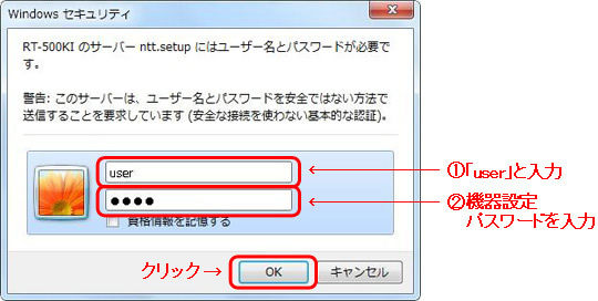 [ntt.setupに接続]が表示されます。[ユーザー名]に「user」と入力し、[パスワード]に初期設定時に設定した機器設定用パスワードを入力し、[OK]をクリックします。 |
