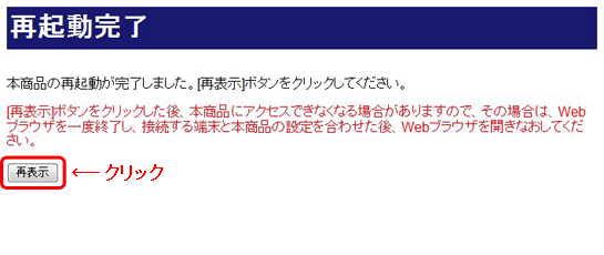 ファームアップ中は以下の画面が表示されます。ファームウェア更新完了するまで電源を抜かずにお待ちください。アラームランプ消灯後、「再表示」をクリックします。 |