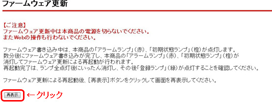 ファームアップ中は以下の画面が表示されます。ファームウェア更新完了するまで電源を抜かずにお待ちください。アラームランプ消灯後、「再表示」をクリックします。 |