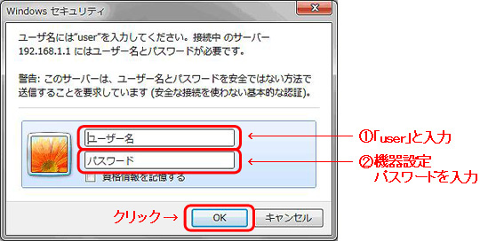 [ntt.setupに接続]が表示されます。[ユーザー名]に「user」と入力し、[パスワード]に初期設定時に設定した機器設定用パスワードを入力し、[OK]をクリックします。