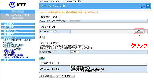 ファームウェアの自動更新は順次実施しておりますので、「自動更新」と設定している場合でもすぐにファームウェアの更新が実施されない場合があります。早期にファームウェアを更新したい場合は、本商品のWeb設定画面から手動にて実施してください。 (以下バージョンアップ方法をご覧ください)