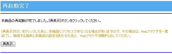 8. ファームアップ中は以下の画面が表示されます。ファームウェア更新完了するまで電源を抜かずにお待ちください。アラームランプ消灯後、「再表示」をクリックします。