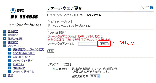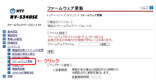 電話機からのバージョンアップ方法 電話機のハンドセットを取り上げた時「ピーピーピーピー」という音が「ツー」の前に聞こえる場合は、以下の方法により電話機からファームウェアの更新が可能です。 1. 電話機の電話回線ダイヤル種別を「DP」でお使いの場合は、「PB」に変更する ※ 電話機の電話回線ダイヤル種別の変更方法は、電話機の取扱説明書をご覧ください。 2. 電話機のハンドセットを取りあげる 3. 電話機のダイヤルボタンを「*」「*」「*」「1」「1」の順番で押す 4. 「ププ」という音が聞こえたら、ハンドセットを戻す バージョンアップ中は、本商品の電源を切らないでください。 ※ バージョンアップ中は、本体の「アラーム」ランプと「初期状態」ランプが同時点灯します。 約3分程度でバージョンアップが完了し、その後、「アラーム」ランプは消灯し、「初期状態」ランプは通常のランプ表示に戻ります。 5. 上記の手順1で電話機の電話回線ダイヤル種別を変更した場合は、元の設定に戻す ※ 電話機のトーンボタン等で電話回線ダイヤル種別の変更を行った場合は、ハンドセットを戻すと自動的に元のダイヤル種別に戻ります。 詳細については、電話機の取扱説明書をご覧ください。 Web設定画面からのバージョンアップ方法 1. 以下のファームウェアを右クリックして、「保存」を選択し、ご利用のPCにダウンロードします。 2. PCとRV-S340SEのLANポートがLANケーブルで接続されていることを確認し、WebブラウザのURL欄に「http://ntt.setup/」を入力します。 [ntt.setupに接続]が表示されます。[ユーザー名]に「user」と入力し、[パスワード]に初期設定時に設定した機器設定用パスワードを入力し、[OK]をクリックします。 3. 「メンテナンス」から「ファームウェアの更新」を選択します。 4. 「ファイル指定」の「参照…」をクリックします。 5. ダウンロードしたファイルを選択し、[開く]をクリックします。 6. 選択したファイルを確認して[更新]をクリックします。 7. 以下のダイアログが表示されますので、「OK」をクリックします。 8. ファームアップ中は以下の画面が表示されます。ファームウェア更新完了するまで電源を抜かずにお待ちください。アラームランプ消灯後、「再表示」をクリックします。 バージョンアップ方法については、お手元の取扱説明書をあわせてご覧ください