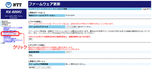 「メンテナンス」から「ファームウェア更新」を選択します。 |