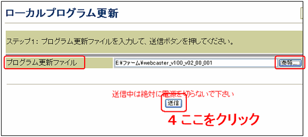 - 設定画面のメニュー[保守]から[ローカルプログラム更新]を選択し、「プログラム更新ファイル」で[参照]をクリックします。