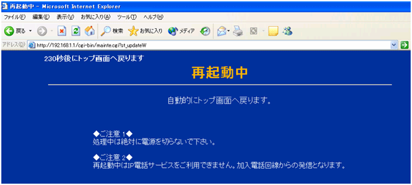 途中で電源を落としますと装置本体のファーウェアが破壊され、復旧不可能な状態となる場合がございます。