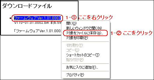 「ファームウェアVer.1.01.0002」の部分を右クリックし、「対象をファイルに保存」等を選択してダウンロードしてください。