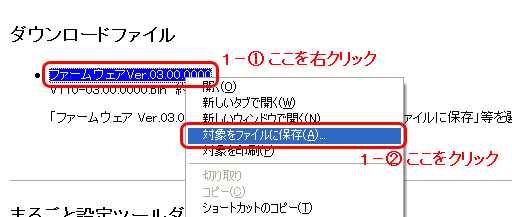 「ファームウェア Ver.03.00.0000」の部分を右クリックし、「対象をファイルに保存」等を選択してダウンロードしてください。