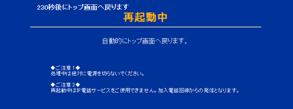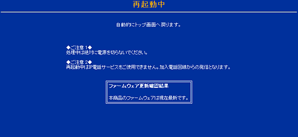 - 「ファームウェア更新確認中」画面が表示されます。1〜2分程度で「再起動中」画面が表示されます。「ファームウェア更新確認中」画面表示中や「再起動中」画面が表示中は電源を抜かずにお待ちください。再起動が完了するまでに約5分程度かかります。再起動完了後に、「かんたん設定」画面が表示されます。「かんたん設定画面」が表示されたら、バージョンアップ作業は完了です。