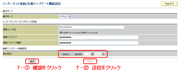 - 再起動が完了すると「インターネット接続/自動アップデート機能設定」画面が表示されます。自動アップデート機能設定の[実行時刻]を設定し、「確認」をクリックします。「送信」ボタンが表示されたら、「送信」をクリックします。「引続きファームウェアの更新確認を行います。」が表示されますので、「OK」をクリックします。