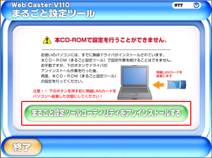 「再起動」ボタンをクリックしたときに、『簡単設定CD-ROMを一度CD-ROMドライブから取り出し、再セットしてください。』というメッセージがポップアップにて表示されますが、「marugoto-w.exe」をダウンロードして実行した場合は、引き続き9の手順を実施してください。