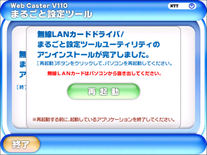 - アンインストールが完了するとPCの再起動が必要になりますので、無線カードを抜いてから「再起動」をクリックしてください。