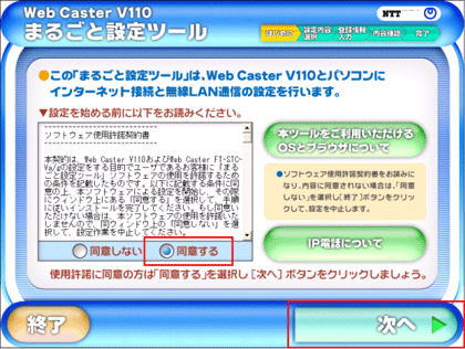 - 「ソフトウェア使用許諾契約書」が表示されますので、文章お読みのあと「同意する」をクリックし「次へ」をクリックしてください。