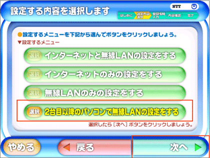 - 「2台目以降のパソコンで無線LAN設定の設定をする」をクリックし、「次へ」をクリックして下さい。