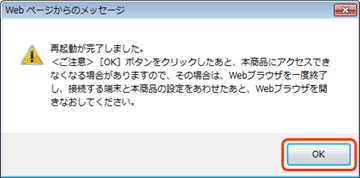 完了すると、再起動完了のダイアログが表示されます。IP電話ランプが緑点灯していることを確認し、「OK」をクリックすると、トップページが表示されます。 |
