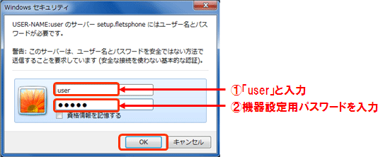 [ユーザー名]に『user』と入力し、[パスワード]に初期設定時に設定した機器設定用パスワードを入力し、「OK」をクリックします。 |