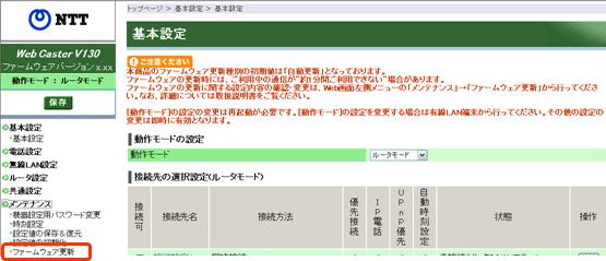 「メンテナンス」から「ファームウェアの更新」を選択します。 |