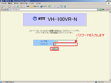 ユーザ名「user」、パスワード「お客様が設定されたパスワード」(初期値は「user」)を入力し、「ログイン」ボタンをクリックしてください。