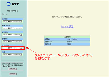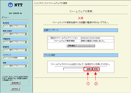 表示された画面左側フレームのメニューから「メンテナンス」-「ファームウェアの更新」を選択します。