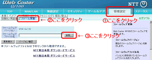 - メニュー画面において、「管理設定」から「ファーム更新」を選択します。続いて「ファームウェアファイル名」の「参照」ボタンクリックします。