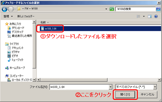 「ファームウェア Ver.1.64」の部分を右クリックし、「対象をファイルに保存」等を選択してダウンロードしてください。