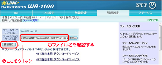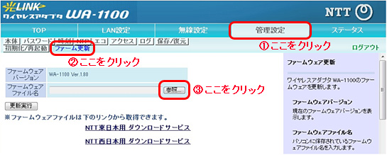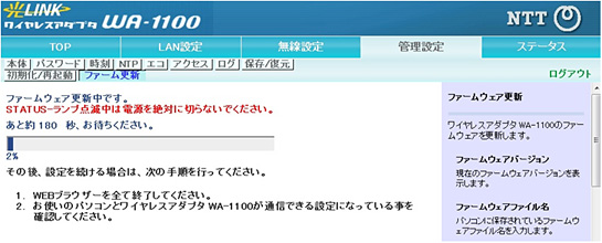 - ファームウェアのアップデート中は絶対に本商品とパソコンを接続しているLANケーブルを抜かないでください。本商品が起動できなくなり、使用できなくなる場合があります。