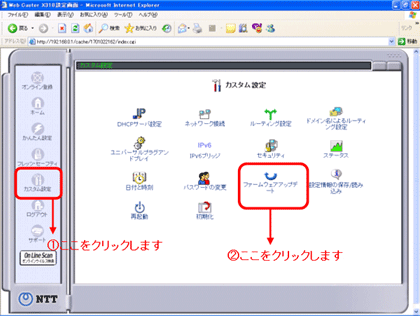 [カスタム設定]画面から[ファームウェアアップデート]ボタンをクリックします。