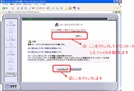 - ファームウェアのアップデート中は絶対に設定画面中の「キャンセル」ボタンをクリックしないでください。ルータが起動できなくなり、使用できなくなる場合があります。万一、「キャンセル」ボタンをクリックしてしまった場合には、ルータの電源を落としたり、再起動したりせずに、再度、ファームウェアのアップデートをしてください。