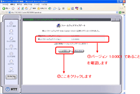 - ファームウェアアップデートを確認する画面に切り替わりますので、新しいバージョンが1.0.0001であることを確認して、[OK]ボタンをクリックします。