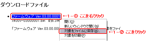 「ファームウェア Ver.03.00.0001」の部分を右クリックし、「対象をファイルに保存」等を選択してダウンロードしてください。
