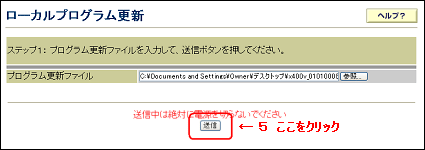 - 設定画面のメニュー[保守]から[ローカルプログラム更新]を選択し、「プログラム更新ファイル」で[参照]をクリックします。