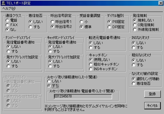 TEL1ポート設定画面/