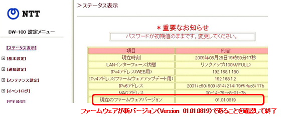 - 再度ログインし、ファームウェアが新バージョン(Version 01.01.0819)であることを確認して終了です。