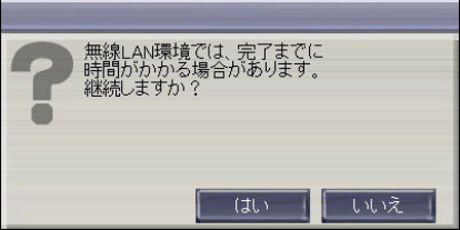 | ◆無線LAN使用中の「VP1000」のリモートアップデート機能のご利用について ・無線LAN使用中の「VP1000」のアップデートは、お客様の環境によりますが、ネットワークのデータ転送能力の違いにより、有線LAN使用時よりも完了までに時間がかかることがありますので、ご注意ください。 なお、確認のため無線LANでアップデートを行うと次のようなメッセージが表示されますので、「はい」を選択してアップデートを進めてください。 |