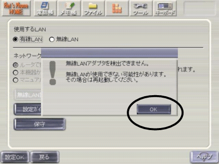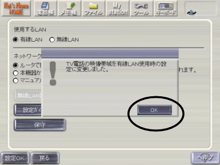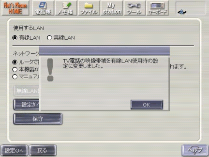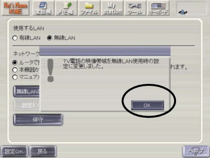 | ◆「VP1000」で無線LANと有線LANの切り替えについて ・本紙の切り替え手順に従って正しく切り替えてください。手順どおりに行わないと、接続状態と接続状態アイコンが一致しない場合や、正しく接続できない場合があります。この場合には、設定を再確認して「VP1000」を再起動してください。 ・有線LANと無線LANの切り替えを行った場合は、「使用するLAN」の選択後、メッセージに従って「VP1000」を再起動してください。 ・「VP1000」では、有線LANと無線LANは同時に使用できません。また、同時に複数の無線LANアダプタはご使用できませんので、ご注意ください。 ・有線LANから無線LANに、または無線LANから有線LANに切り替えたあと「UPnPポートマッピングに失敗しました( xx )」が表示されることがあります。その場合は、「VP1000」に付属のマニュアルのエラーメッセージの対処に従って操作してください。 |