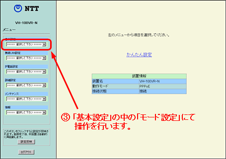 ログイン後、左フレームのプルダウンメニューから「基本設定」→「モード設定」をクリックし、モード設定ページを表示します。(下図中の3)