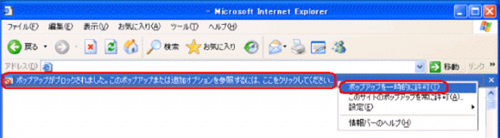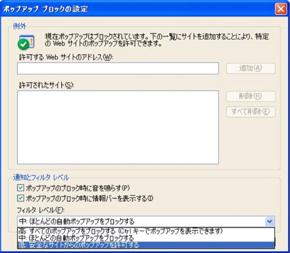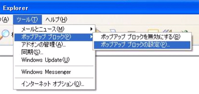 その場合は、『Internet Explorer』-『ツール』-『ポップアップ ブロック』のフィルタレベルを「低」に設定してください。