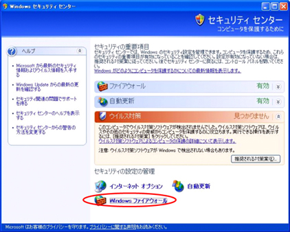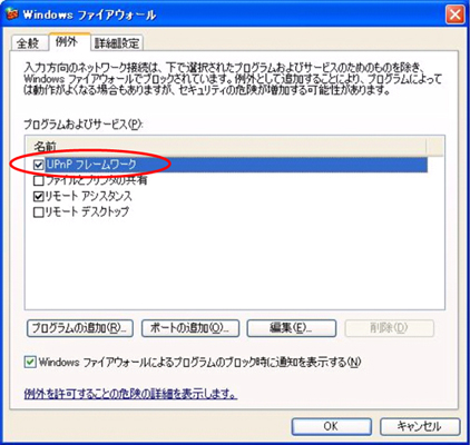 WindowsXPの既存バージョンからSP2へアップデートした場合を除き、Windowsファイアウォールの設定が「UPnPフレームワーク」を例外としない初期値となっているため、WindowsXPSP2のプリンストールPC等で、ルータのUPnP機能を使用する場合はWindowsファイアウォールの設定を変更する必要があります。 |